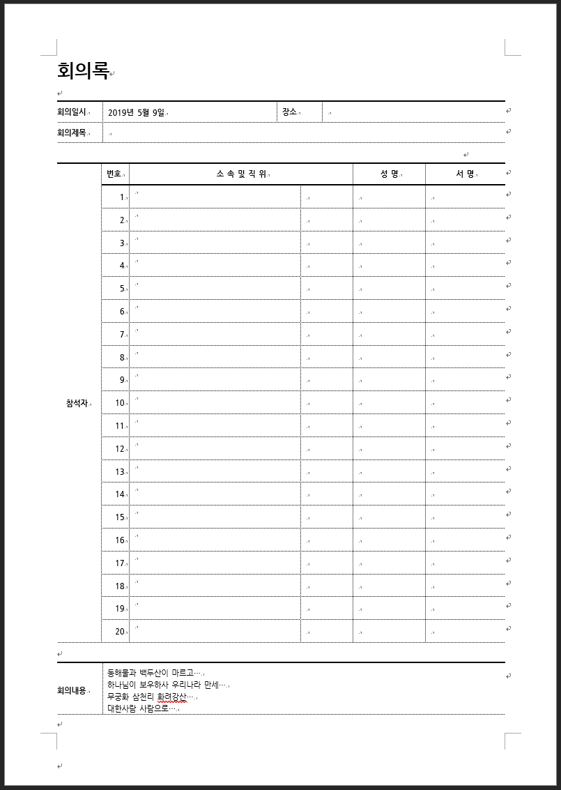 Microsoft 워드로 작업한 회의록 양식입니다.