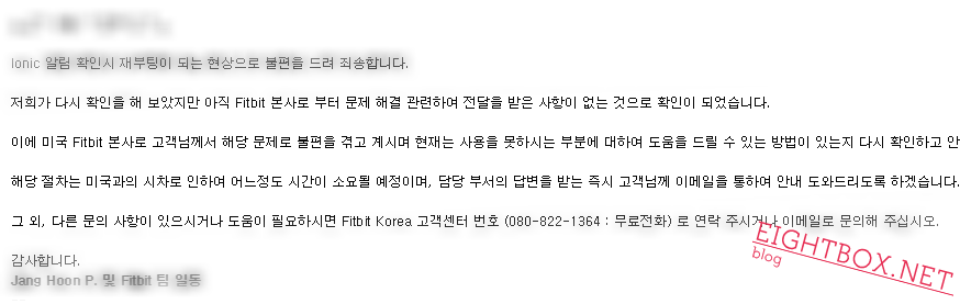 사용중인 Fitbit의 알림버그(알람보기시, 재부팅)로 서비스문의한,