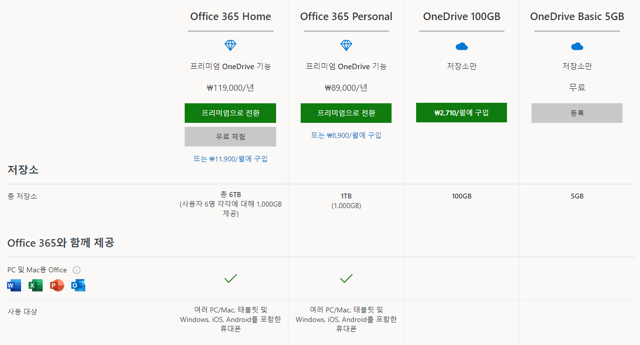 1TB상품 이용시 Office365와 함께 사용할수 있다는 장점과 뛰어난 호환성으로 어디서든 다 이용이 가능하다.