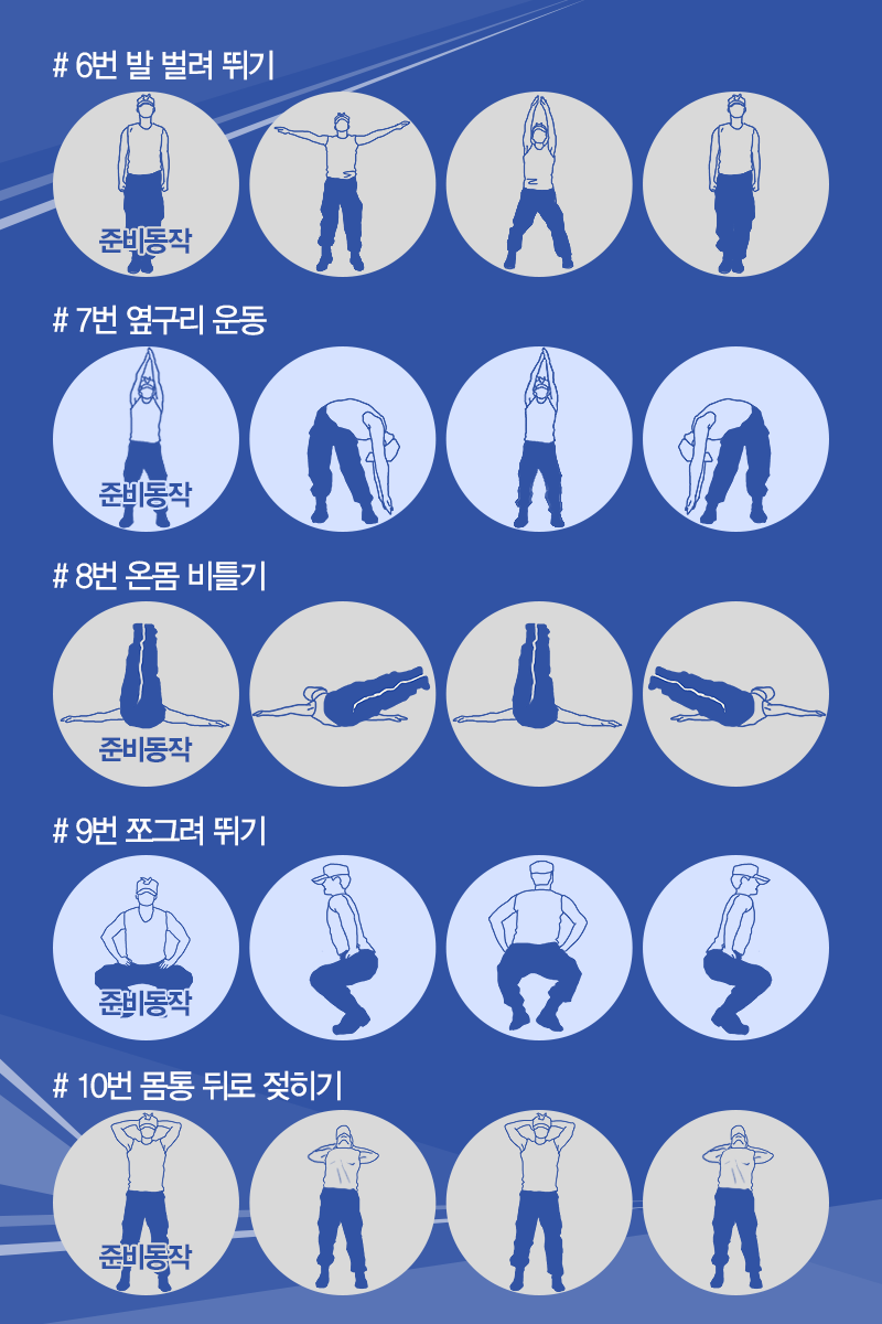 개인적으로 2번 굽혀닿기와 4번 쪼그려뻗치기를 조합, 그리고 14번까지 합쳐서 사용하는게 칼로리 소모가 좋은듯.