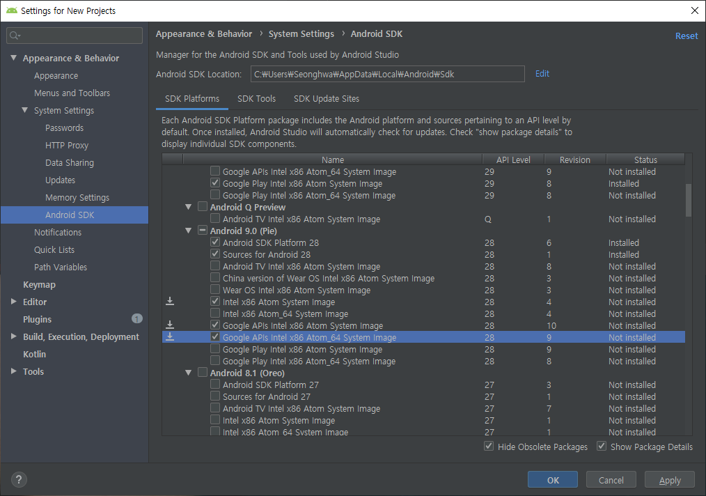 Android 9.0 (Pie)를 설치한다. (이 버전 기준으로 앱 만들기 시작합니다 :D, 보고 있는 책도 사이트도 9.0임)