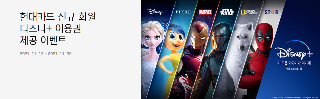 현대카드 홈페이지 및 앱에서 대상 카드 신규발급시 디즈니플러스 이용권 1~3개월 제공