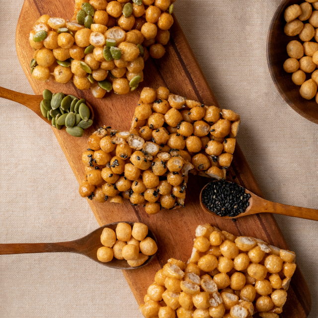 콩알만한 과자로 만든 강정으로, 꾀돌이같은 과자 알갱이가 물엿 범벅이 되어 덩어리가 되어 굳어 있다. 품질은 적당히 바삭한 수준에서 돌덩이처럼 딱딱한 수준도 있고 엿처럼 찐득한 경우도 있는 등 제조 수준에 따라 다양하다. 제품에 따라서는 호박씨나 땅콩 등의 견과류가 첨가되기도 한다.