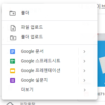 드래그 앤 드롭으로 파일을 구글 드라이브의 원하는 경로에 올려도 되고, 파일 업로드 또는 폴더 업로드를 사용해서 직접 지정하여 올릴수도 있다.