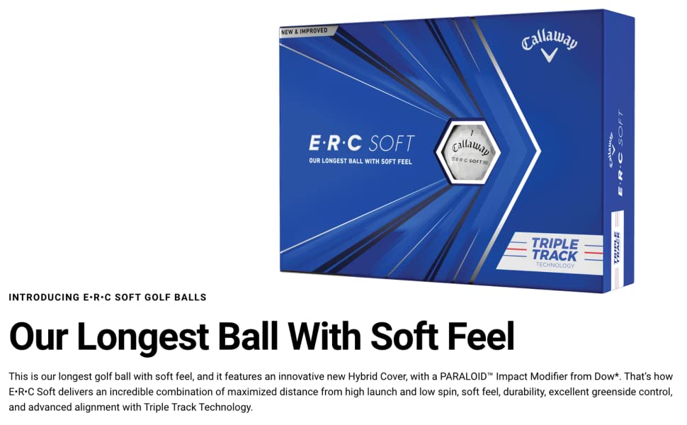 ERC 소프트는 부드러운 느낌이 특징이며 제품군 중 가장 긴 길이의 골프공으로 탁월한 성능과 필드에서의 개선된 제어력을 자랑합니다. 다양한 소재로 제작된 고성능 하이브리드 커버, 하이 에너지 코어, 고속 맨틀 및 트리플 트랙 정렬이 특징