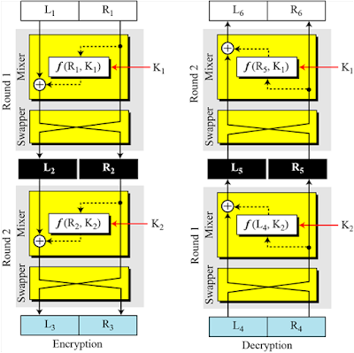 Feistel 구조에서 입력 n 비트를 두개의 블록 (L₀, R₀)으로 나누어 라운드 함수를 F, 라운드키를 Ki라 할때, ⅰ번째 라운드 과정은 다음과 같다. 주의할 점은 최종 라운드에서는 좌우 블록을 한 번 더 교환해야 한다.