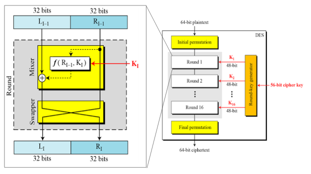 DES는 16번의 라운드 함수를 사용한다. DES의 각 라운드 함수는 Feistel 암호로 되어 있다.