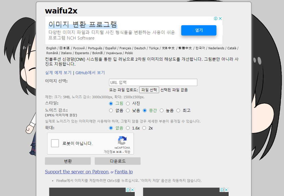 waifu2x 컨볼루션 신경망(CNN) 시스템을 통한 딥 러닝으로 2차원 이미지의 해상도를 개선합니다. 그림뿐만 아니라 사진도 지원합니다. 실제 예제 보기 | GitHub에서 보기 This website uses Google Analytics to h