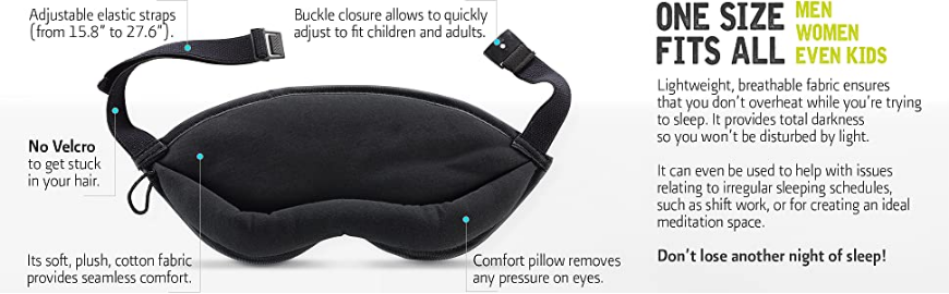 모두에게 맞는 원 사이즈 - 심지어 어린이들까지: 이 수면 마스크는 버클이 달린 신축성 있는 스트랩을 사용하여 어린이 또는 성인의 핏을 빠르게 조절할 수 있습니다. 벨크로가 없어 머리에 끼지 않습니다
