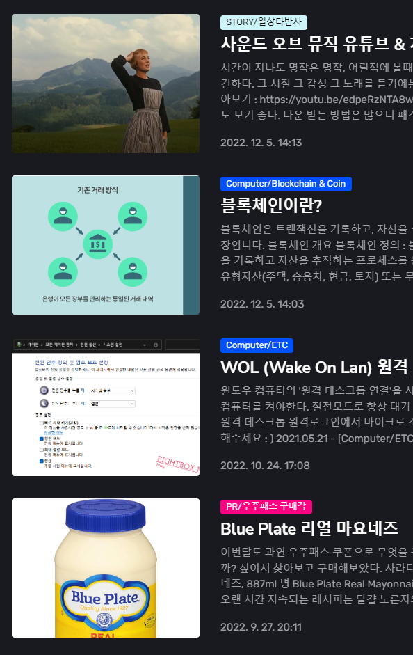 아! 그리고, 글 리스트에서 카테고리 부분은 카테고리 설정에 따라서 색상을 다르게 표현하게 만들었다.