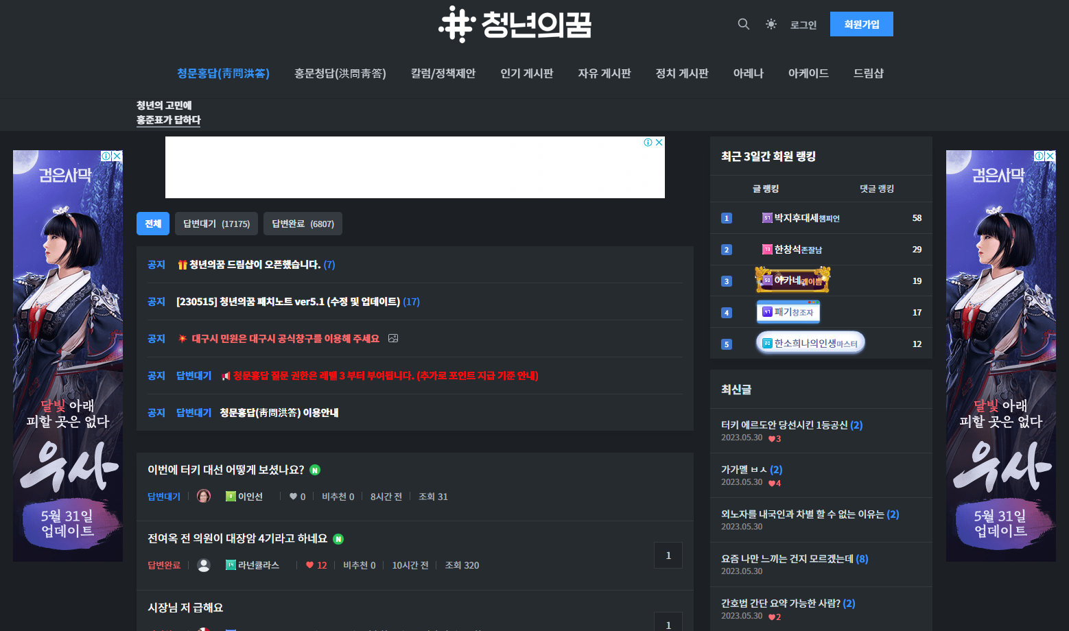 근데 청년의 꿈 사이트는 관리가 안되는건가.. 게시물 리스트에서 본문으로 글 넘어가는게 너무 느린데..?
