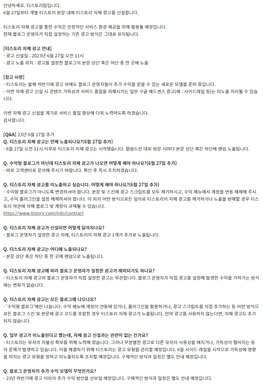 5월 마지막날 티스토리에서 자체 광고를 신설한다는 공지가 올라왔다.