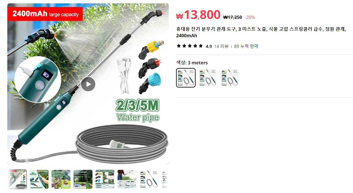 논밭에 농약살포할때도 사용할까 싶어서 세차건을알아보았다.