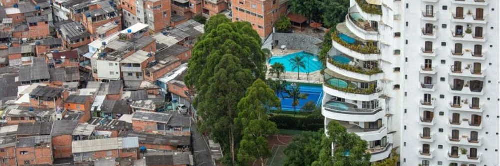 한 도시 내 빈민가(왼쪽)와 인근 고급 주택가(오른쪽)의 극명한 대비. 사회적 불평등은 도시화 시대에 더욱 두드러지게 나타나는 문제입니다. 사상 처음으로 전 세계 도시 인구가 농촌 인구를 앞질렀지만, 도시는 기회를 제공함과 동시에 심화된 격차를 드러내고 있습니다. 유엔 보고서에 따르면 도시 지역이 농촌보다 전반적으로 불평등도가 높아, 도시 내 소득 상위 10%와 하위 10%의 격차가 상당한 것으로 나타났습니다. 예를 들어 많은 개발도상국 대도시에는 고급 주상복합 건물 옆에 빈민가가 밀집하는 모습이 공존하며, 이러한 공간적 격차는 교육·의료 서비스 접근성이나 생활환경의 질 차이로 이어집니다. 2022년 현재 전 세계 도시 거주자의 약 24.8%에 해당하는 11억 명 이상이 슬럼 혹은 불량주거 지역에 거주하고 있으며, 2015년 이후 7년 만에 슬럼 인구가 1억3천만 명 이상 증가하는 등 상황이 더욱 악화되고 있습니다. 도시 내 극빈층은 기본적인 상하수도, 위생, 전기 등의 서비스도 부족한 환경에 놓여 있는 반면, 다른 한편에는 첨단 인프라와 풍부한 자원을 향유하는 부유층 거주 지역이 존재하는 등 계층 간 삶의 질 격차가 뚜렷합니다. 이러한 불평등은 경제적 기회와 자원의 불균등 분배, 부동산 가치 상승에 따른 저소득층 주거 불안정, 교육 및 일자리 격차 등의 구조적 요인에 기인하며, 도시 사회의 통합을 저해하는 요인이 되고 있습니다.