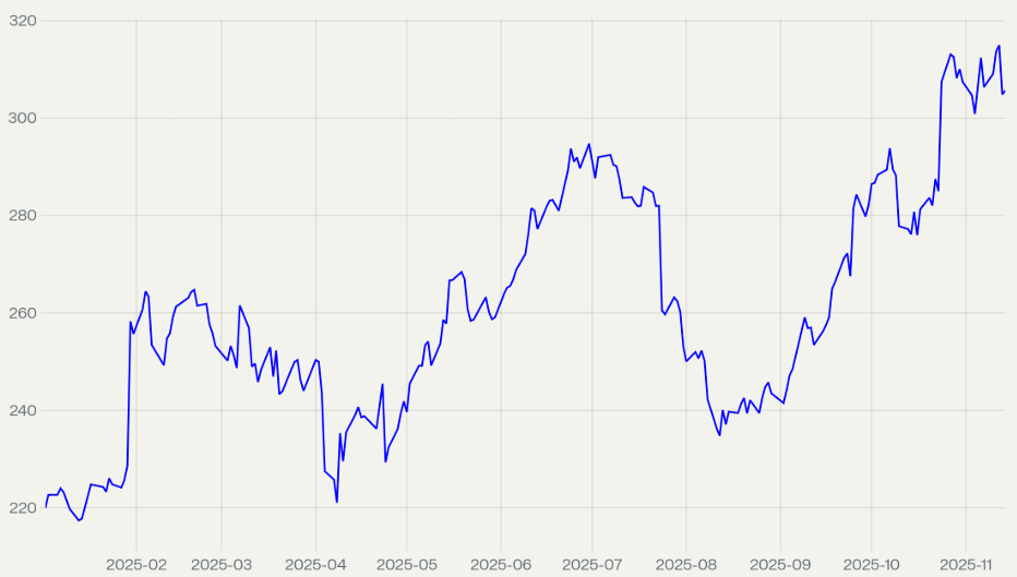 IBM은 2025년 들어 AI·하이브리드 클라우드·양자컴퓨팅을 축으로 한 본격적인 사업 전환 성과를 시장에서 인정받으며, 주가는 연초 대비 38.99% 상승했습니다. 11월 12일에는 $324.90의 52주 최고가를 기록했으며, 현재 $305.69 수준에서 거래되고 있습니다. 이는 장기 침체에서 벗어나 기술 기업으로서의 재평가가 진행 중임을 보여줍니다.